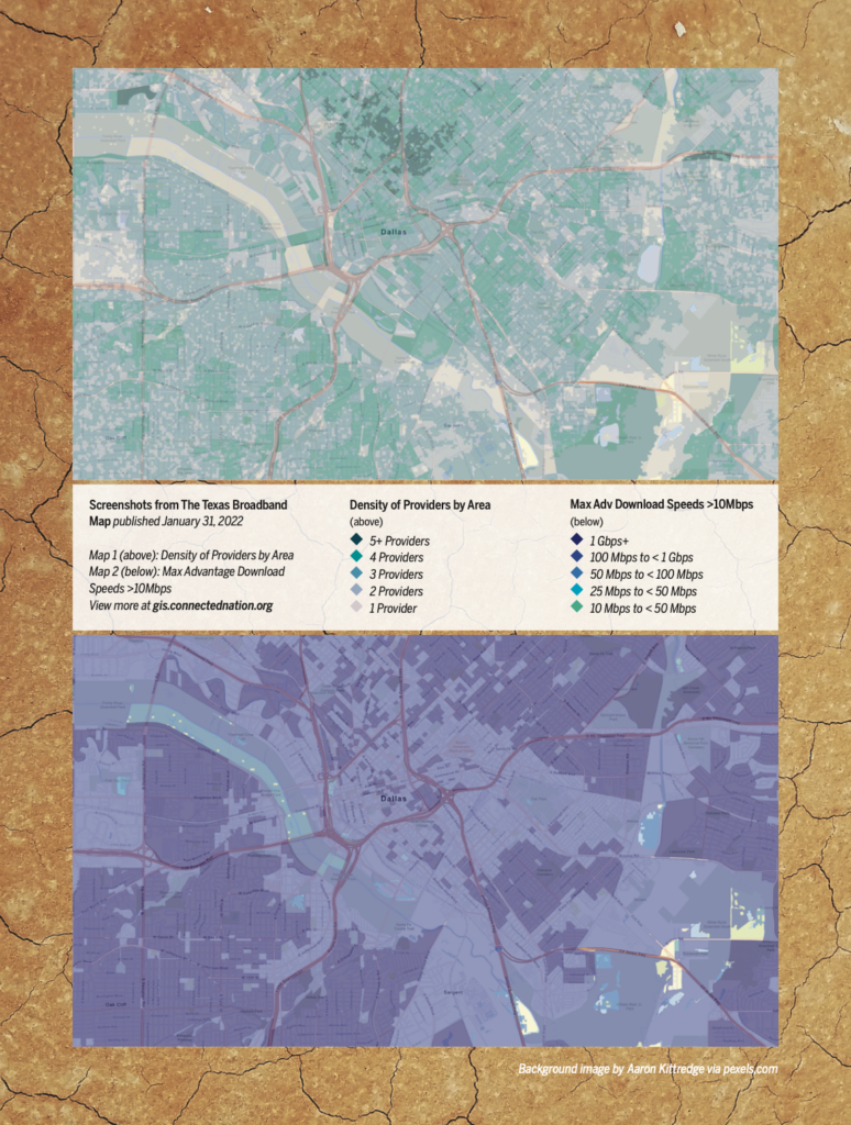 Lawmakers have brought attention to these digital deserts. Texas House Bill 5 was passed on June 15, 2021, which established the Broadband Development Office, or BDO. According to govtech.com, BDO will be “responsible for creating a broadband map that reveals which areas are eligible for financial support, setting an established threshold speed for underserved areas, participating in community outreach, and acting as the subject matter expert to support local governments with funding opportunities.”