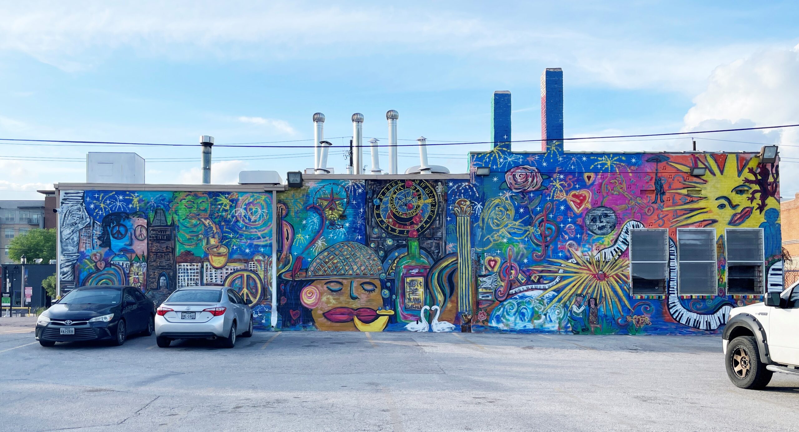 In Dallas, the surfaces we find about the city are not so different from those found in the Mediterranean. The walls of the Deep Ellum neighborhood serve as usable canvas space for painted signs and advertisements, and it’s only natural that they would also serve as canvas for self-expression. Deep Ellum is a neighborhood known locally for its rich demographic history, as well as its deep artistic and industrial roots. As an area that was settled around a railroad junction in the late 1800s, it served as a literal crossroads. The railroad brought a creative class and the earliest blues musicians in North Texas. The predominant art form in the area was music—blues and jazz—that was enveloped by a layer of industry and warehouse building types. As the development of the automobile progressed and space dedicated to manufacturing and assembly grew more ubiquitous, so too did the brick warehouse and factory building types. These buildings, with their expanses of woven brick envelopes, easily lent themselves to visual decoration and advertising, and later to creative expression.