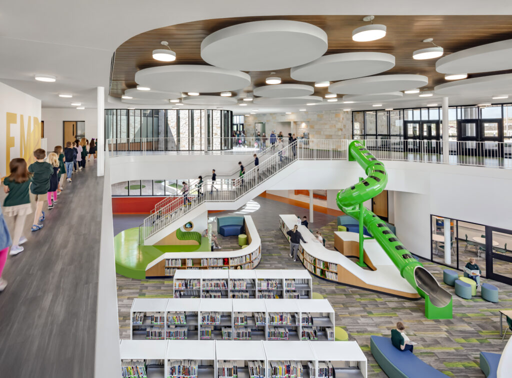 The program itself is straightforward: classrooms, administrative offices, a media center, and support spaces typical of an elementary school. What sets Rolling Hills apart is how these elements relate to one another. Rather than organizing the building strictly around efficiency, the designers arranged spaces to encourage movement, interaction, and choice.