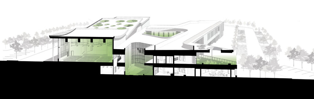 The exterior design includes subtle references to leaf-like shapes, especially along the administration wing, reinforcing the project’s central concept without becoming literal. Daylight and framed views play an important role throughout the school, contributing to student comfort and strengthening ties to the neighborhood.