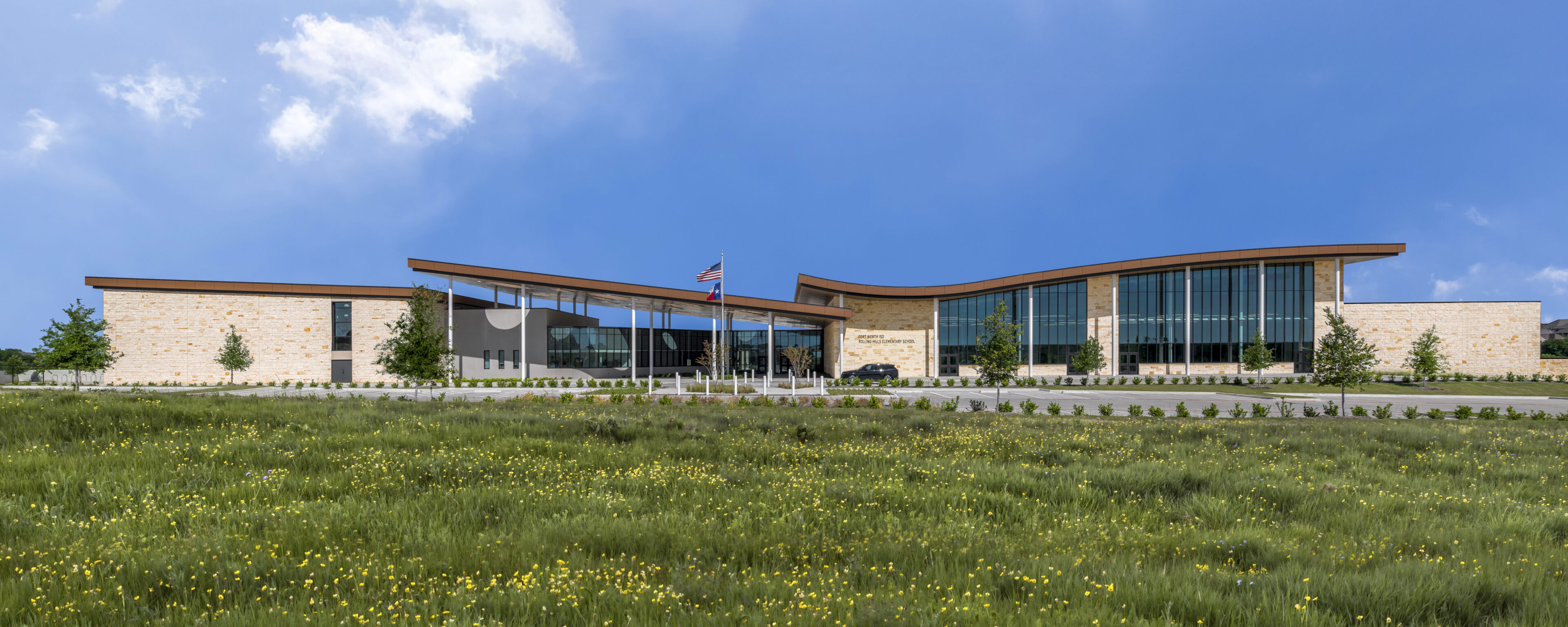 Elementary schools are being asked to do more than ever before. Beyond supporting classroom instruction, they are now expected to address equity, connect with their communities, and adapt to changing educational models. Rolling Hills Elementary, located in the fast-growing southwestern outskirts of Fort Worth and designed by Glenn | Partners for Fort Worth ISD, responds to these demands in a quiet yet whimsical way. At 120,000 square feet, the project explores how familiar spaces can be arranged to create a school that feels open, intuitive, and welcoming.