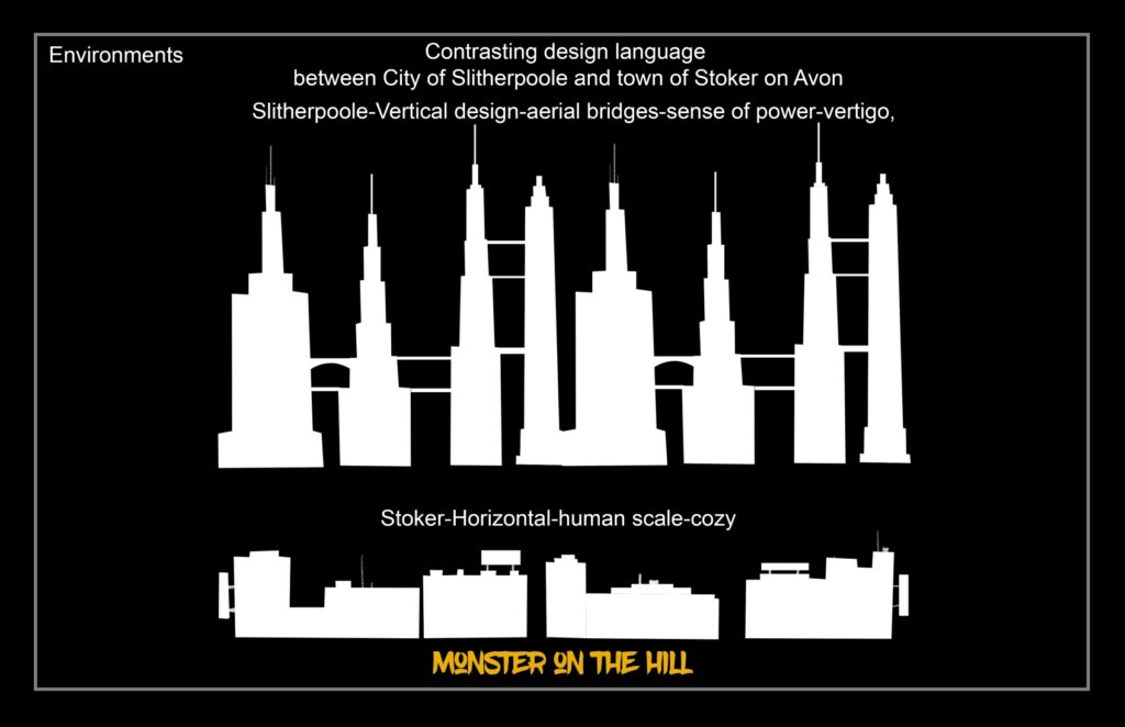 Stoker, the hometown to the protagonists Winnie and Rayburn, is built with a horizontal profile, giving it a more human scale that is cozy and intimate. Slitherpoole, hometown of antagonist Tentacular, has a more vertical profile that gives a sense of power, vertigo and monster scale. The audience might never connect that the city designs evoke familiarity and comfort or power and intimidation, but these feelings help immerse the audience in the story.