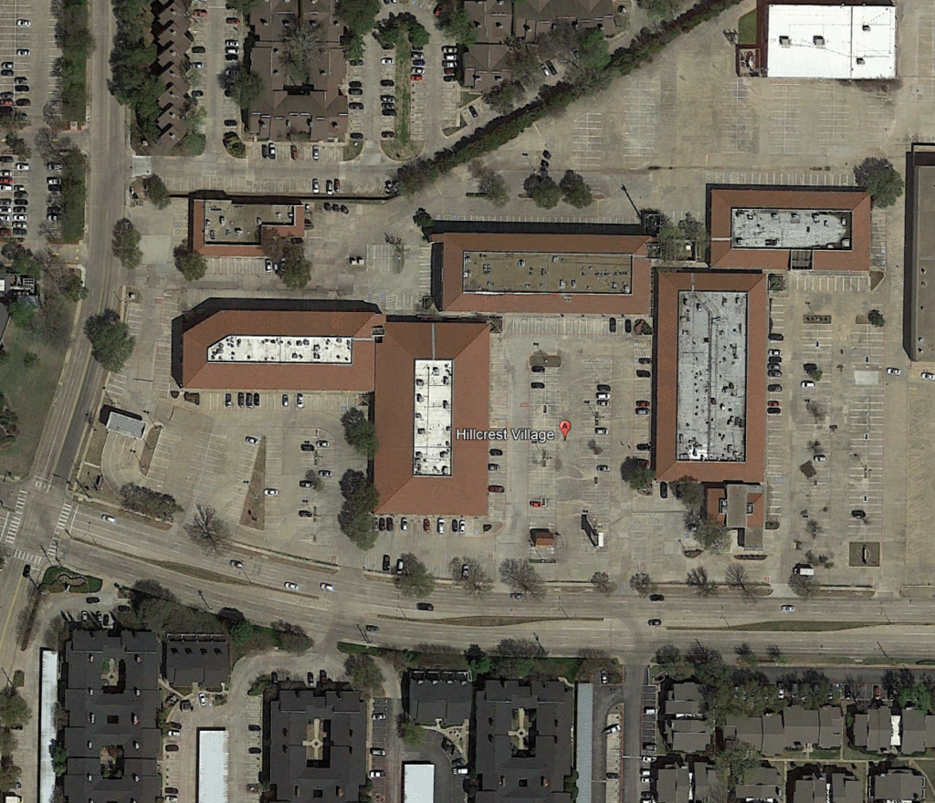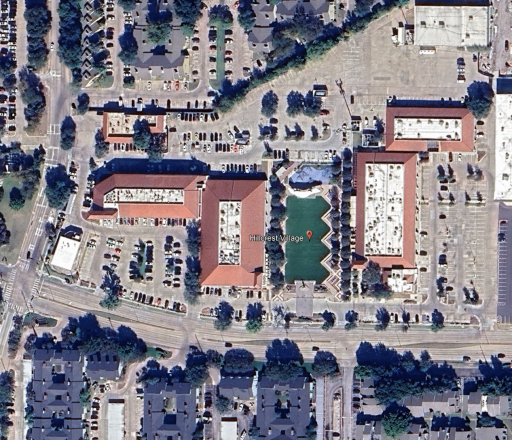 The second layer involves a more deliberate, study-based intervention: reclaiming underutilized asphalt to create a permanent social anchor. This stage is best exemplified by Hillcrest Village Plaza in Dallas. Surrounded by a dense catchment of both single-family homes and apartment complexes, the site possessed a “hidden” pedestrian population historically suppressed by the auto-centric parking moat.